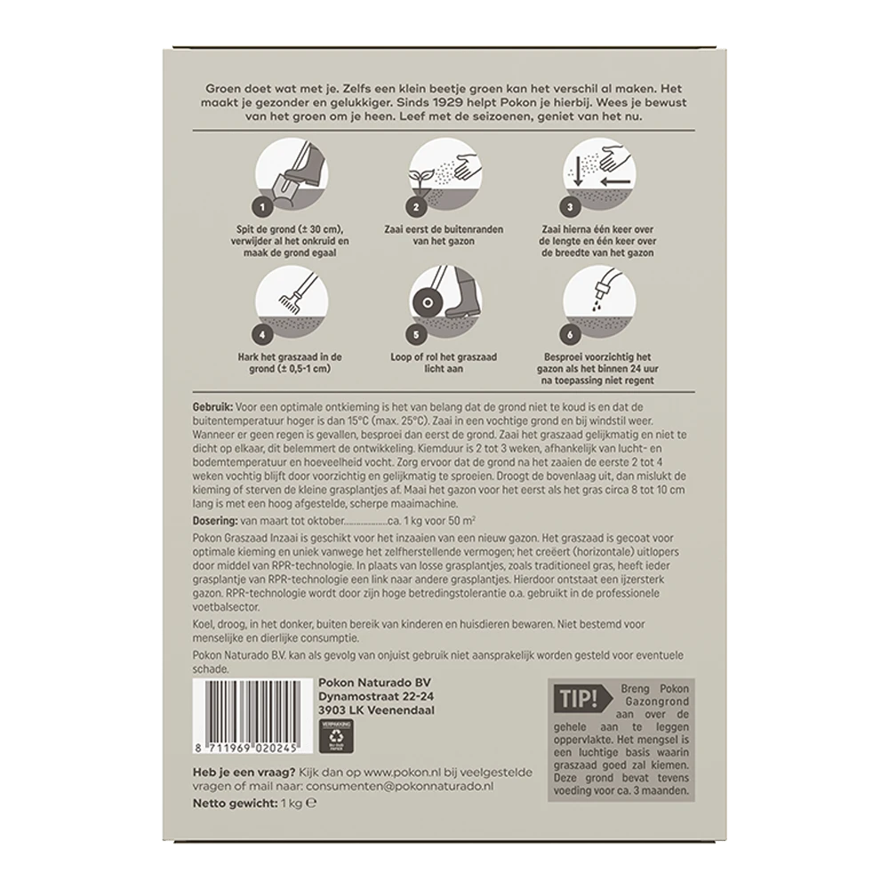 Pokon Graszaad Inzaai is geschikt voor het inzaaien van een nieuw gazon. Het graszaad is gecoat voor optimale kieming en uniek vanwege het zelfherstellende vermogen; het creëert (horizontale) uitlopers door middel van RPR-technologie. In plaats van losse grasplantjes, zoals traditioneel gras, heeft ieder grasplantje van RPR-technologie een link naar andere grasplantjes. Hierdoor ontstaat een ijzersterk gazon, RPR-technologie wordt door zijn betredingstolerantie o.a. gebruikt in de professionele voetbalsector. Voor een optimale ontkieming is het van belang dat de grond niet te koud is en dat de buitentemperatuur hoger is dan 15°C (max. 25°C). Zaai in een vochtige grond en bij windstil weer. Wanneer er geen regen is gevallen, besproei dan eerst de grond. Zaai het graszaad gelijkmatig en niet te dicht op elkaar, dit belemmert de ontwikkeling. Kiemduur is 2 tot 3 weken, afhankelijk van lucht- en bodemtemperatuur en hoeveelheid vocht. Zorg ervoor dat de grond na het zaaien de eerste 2 tot 4 weken vochtig blijft door voorzichtig en gelijkmatig te sproeien. Droogt de bovenlaag uit, dan mislukt de kieming of sterven de kleine grasplantjes af. Maai het gazon voor het eerst als het gras circa 8 tot 10 cm lang is met een hoog afgestelde, scherpe maaimachine.