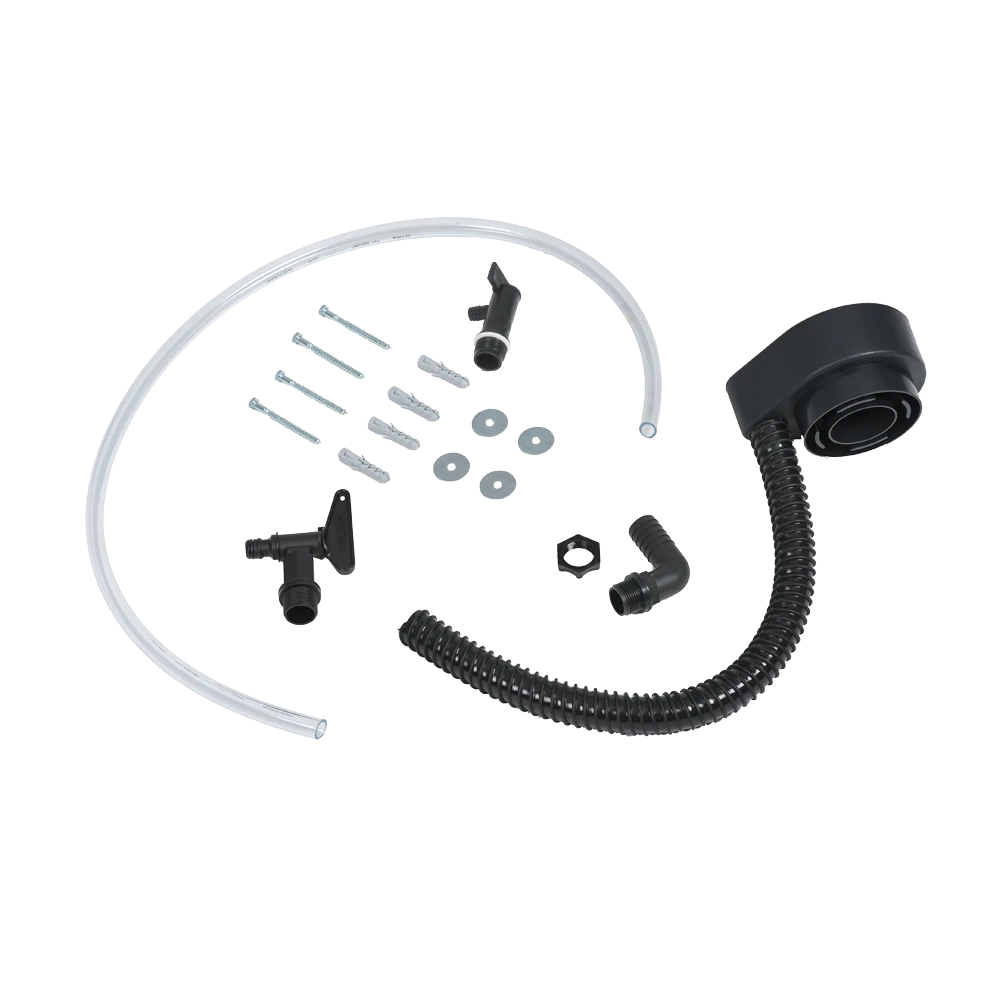 Met de kraan aan de voorkant van de regentank kun je een gieter of emmer vullen door deze gewoon op de grond te zetten. Op de snelloopkraan onderin kan een leiding worden aangesloten, als extra gebruiksoptie.