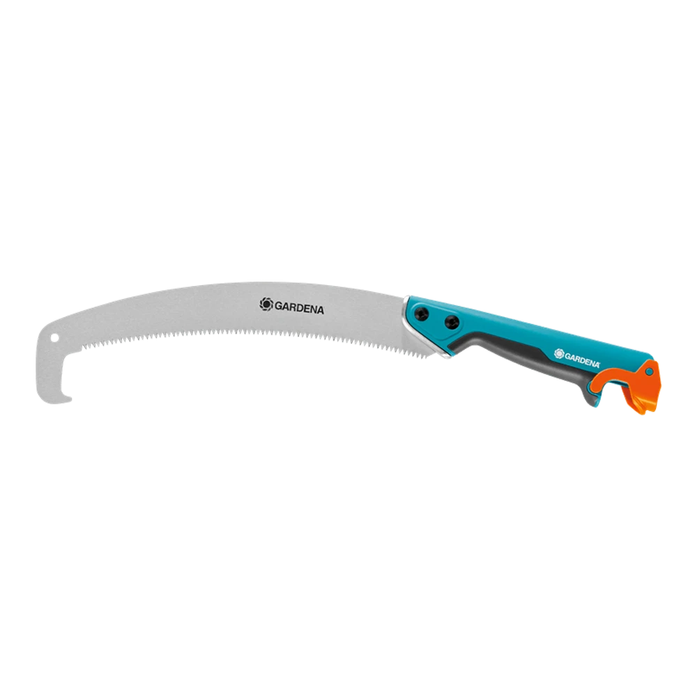 De GARDENA combisystem snoeizaag 300 PP, gebogen, met een zaagblad van 315 mm kan flexibel worden gebruikt afhankelijk van waar u wilt zagen: als u takken onder handbereik wilt zagen, gebruikt u de snoeizaag eenvoudig als “normale” handzaag. De zaag ligt goed in de hand dankzij het ergonomische handvat met softgrip componenten. Als u takken tot een hoogte van 5 meter wilt afzagen, vergroot u het bereik van de snoeizaag door een combisystem telescoop steel te gebruiken. Praktisch: plaats de combisystem steel eenvoudig op de zaag. De veiligheidsvergrendeling garandeert een muurvaste verbinding. Gezette zaagtanden met impulsgeharde tandpunten, aan beide zijden geslepen zorgen voor veilig zagen. Dankzij een speciale coating, is de CS snoeizaag 300 PP, gebogen, optimaal beschermd tegen roest. Een stop op het uiteinde van het handvat beschermt uw hand tegen wegglijden, ook bij trekkende bewegingen. Afgezaagde takken kunnen eenvoudig weggehaald worden met de takhaak aan de bovenzijde van het zaagblad. Met ophangoogje en mesbeschermer om de zaag veilig te kunnen opbergen.